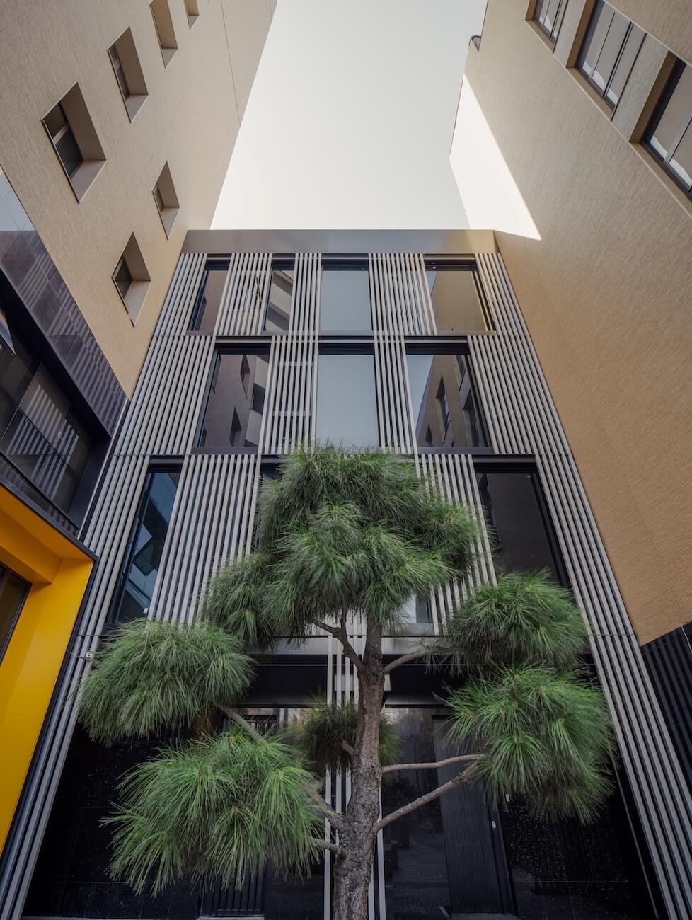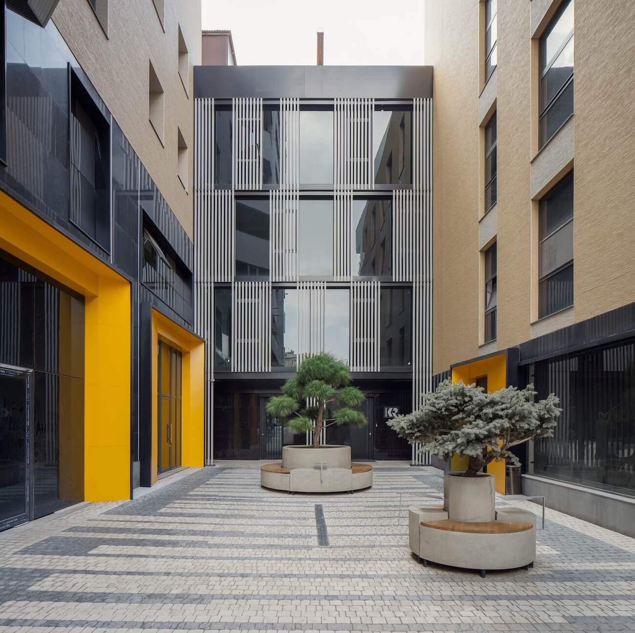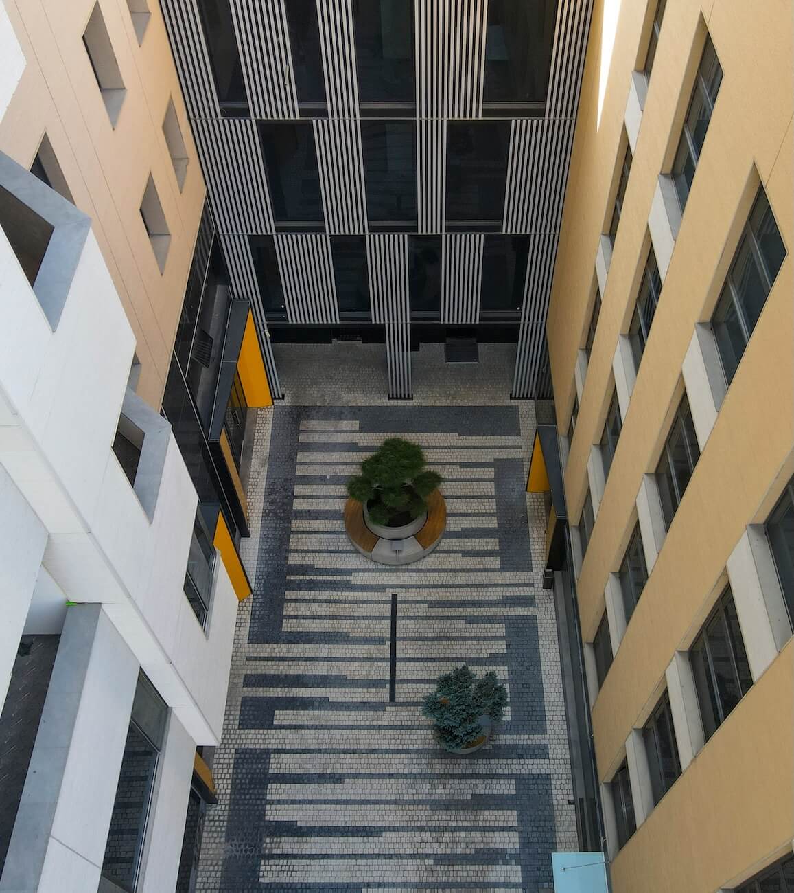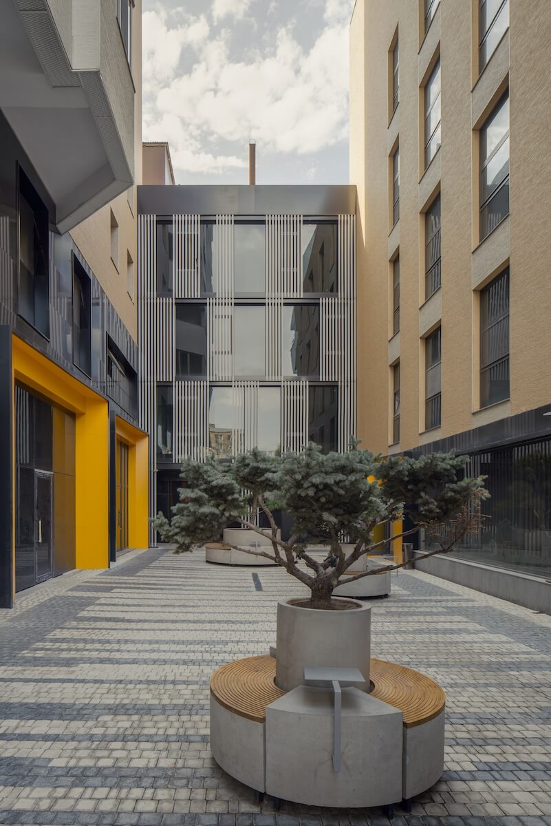 Ներքին բակի ճարտարապետական կերպարը թարմացնելու նպատակով կոմպոզիտ նյութով երեսպատված հին ճակատը փոխարինվել է սև գրանիտով՝ շարունակելով գլխավոր ճակատի ոճը։ Առկա շինության երկու ճակատները քողարկվել են սպիտակ մետաղական ցանցով, որը նաև ծառայում է որպես հիմք ուղղահայաց կանաչապատման համար։